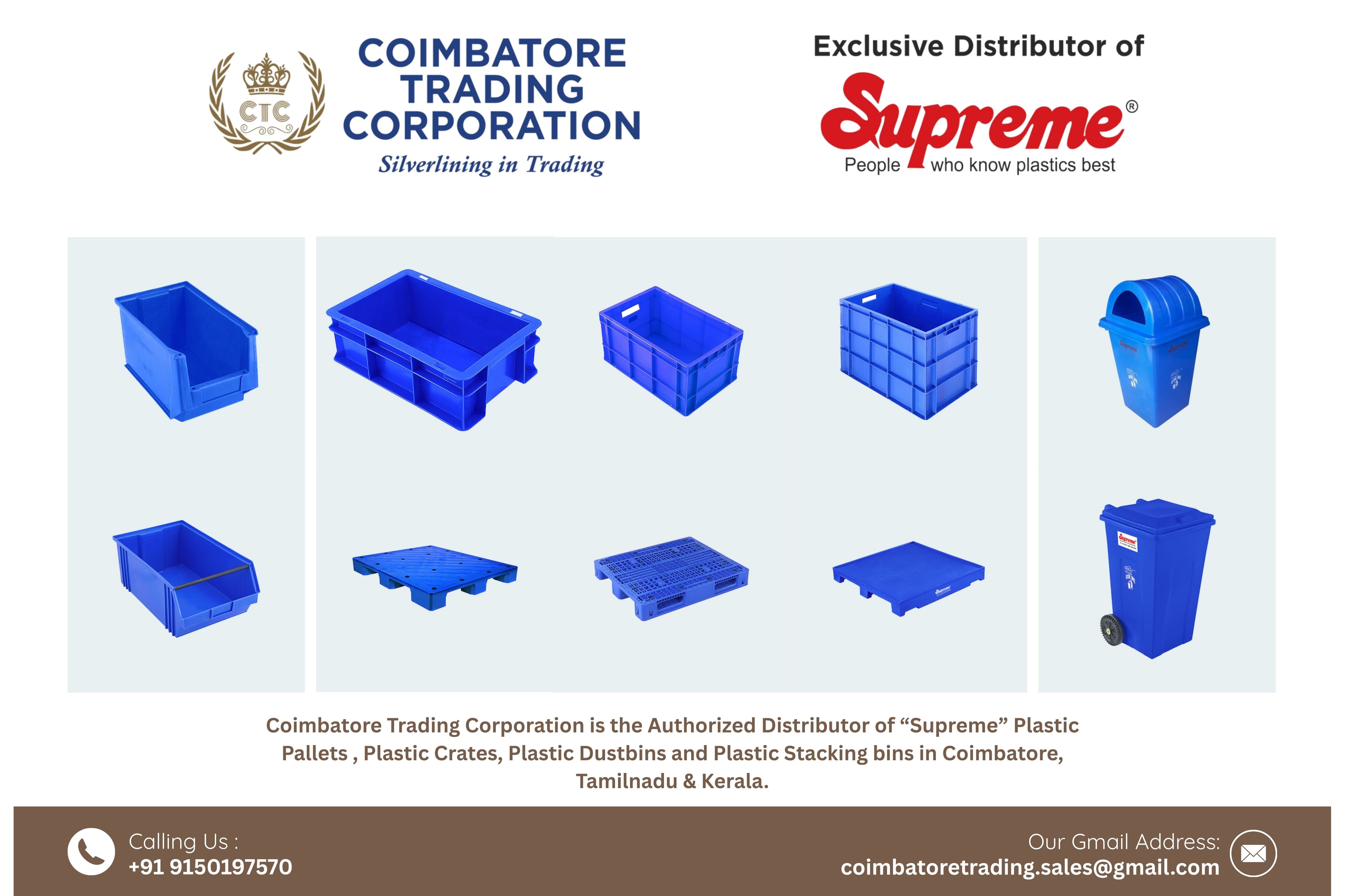 We “Coimbatore Trading Corporation” are the largest supplier of Plastic Pallets, Plastic Crates & Stacking Bins with best quality and at competitive pricing. We are the Authorized Distributor of “Supreme” Plastic Products.