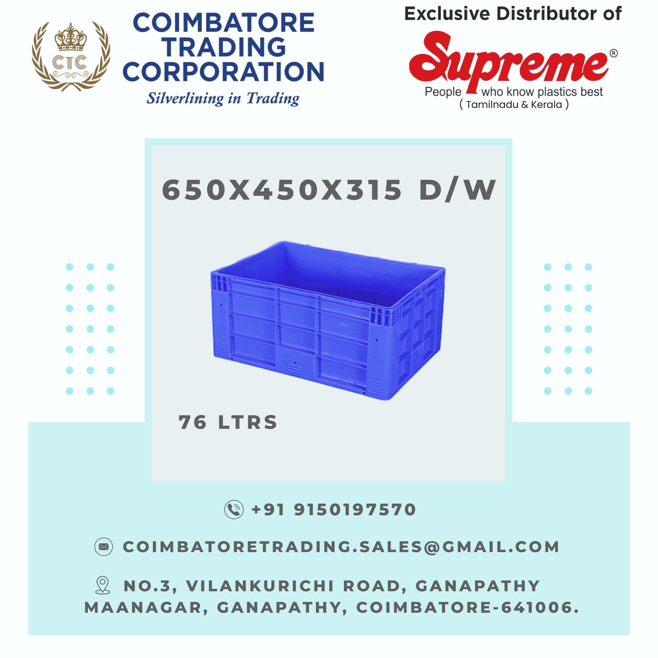 Coimbatore Trading Corporation is the authorized distributor of plastic pallets , plastic crates, plastic dustbins and plastic bins in coimbatore, Tamilnadu #plasticpallets #plasticcrates #plasticdustbins #plasticcratessupplier #plasticbins #plasticcrateswholesale #plasticcratescoimbatore #coimbatoretradingcorporation #leadingsupplier #leadingmanufacturer #bestsupplier #bestmanufacturer #plasticcrateprice #plasticcrateforfood #plasticcratesnearme #plasticcratemanufacturersincoimbatore #plasticcratemanufacturersintamilnadu #wholesaleplasticcratesmanufacturersintamilnadu #topplasticcratesmanufacturersintamilnadu #plasticcratesmanufacturersintamilnaducontactnumber #Plastictraymanufacturersincoimbatore #supremecrates